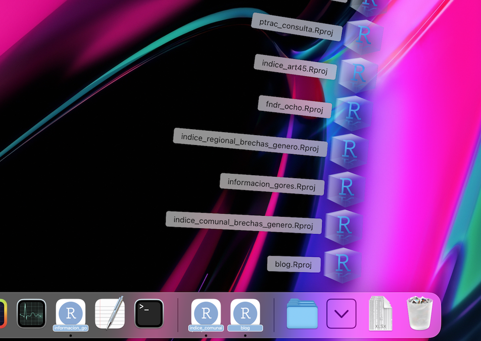 Finalmente podemos agregar la carpeta al Dock para tener un acceso rápido a todos los proyectos de R, y si hacemos clic derecho podemos especificar que se ordenen por fecha de modificación, que aparezcan como abanico, y que el ícono se vea como carpeta.