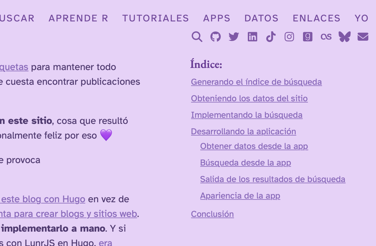 Uno de los cambios principales, y que quería hacer hace mucho tiempo, es mostrar un menú con la tabla de contenidos de cada post (títulos y subtítulos) al lado del texto, para facilitar la navegación. Este tipo de menú aparecen por defecto en los documentos y blogs Quarto, pero no en los de Hugo. Así que tuve que hacer algunos ajustes en el tema que uso.