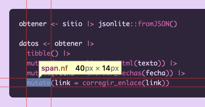 Otro cambio que tenía pendiente desde el inicio de este blog era usar un tema para el código (syntax highlighting) que combinara mejor con los colores del blog. Por fin me dediqué a hacerlo, y fue más fácil de lo que yo pensaba. Ahora el tema del código en este blog y el tema morado que uso en RStudio son iguales 💜