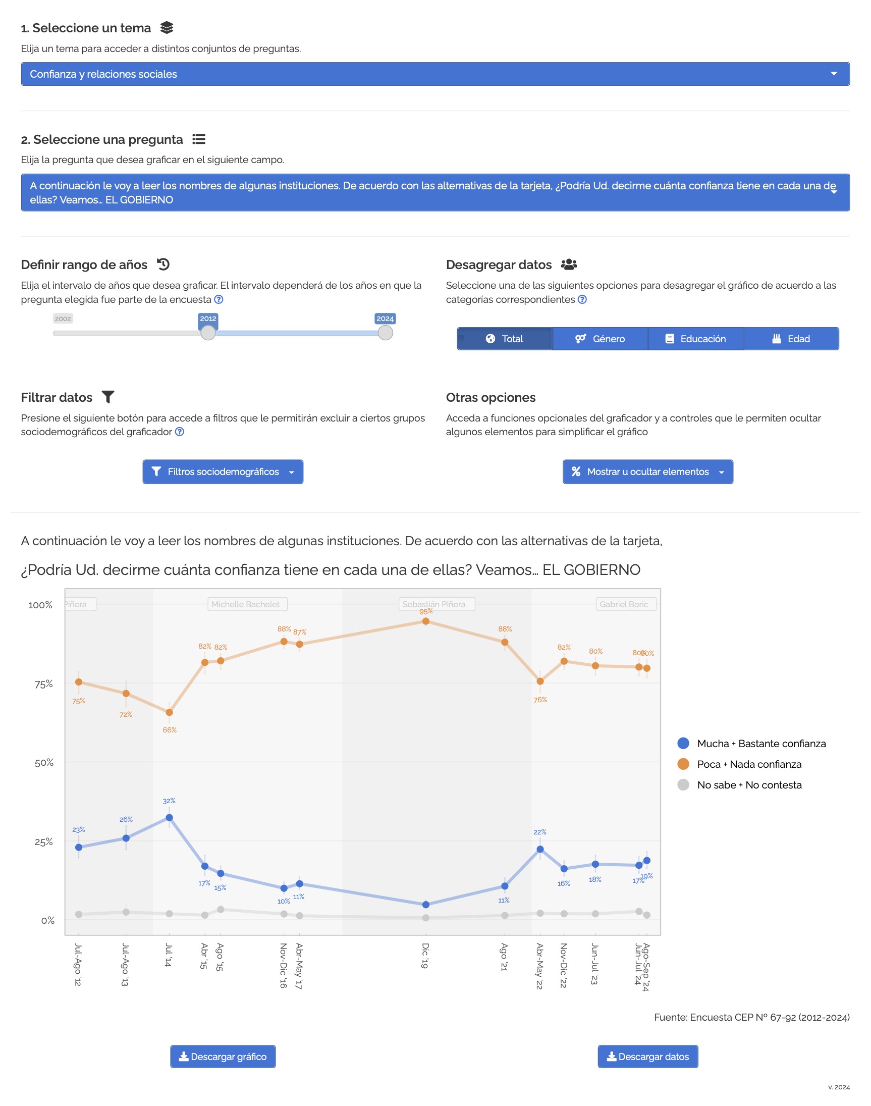Aplicación web que permite visualizar gráficos de los resultados de las encuestas del Centro de Estudios Públicos. Además, permite desagregar resultados en base a categorías sociodemográficas, filtrar grupos, configurar los gráficos y descargar los datos.