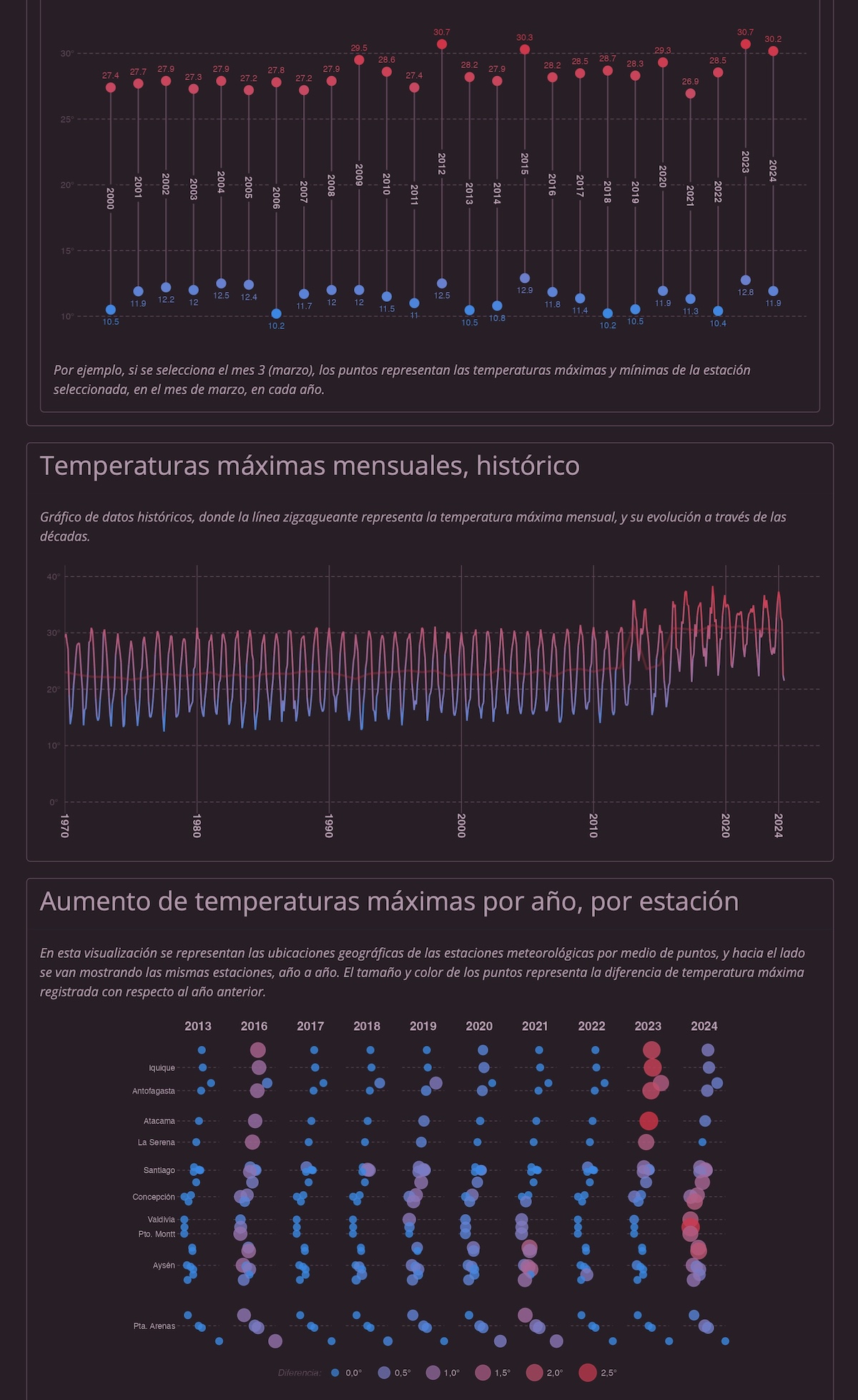 Este repositorio obtiene datos desde el Portal de Datos Abiertos del Estado de Chile mediante web scrapping, unifica todas las fuentes de datos separadas en una sola base de datos de temperaturas, y produce visualizaciones y una plataforma de visualización interactiva.