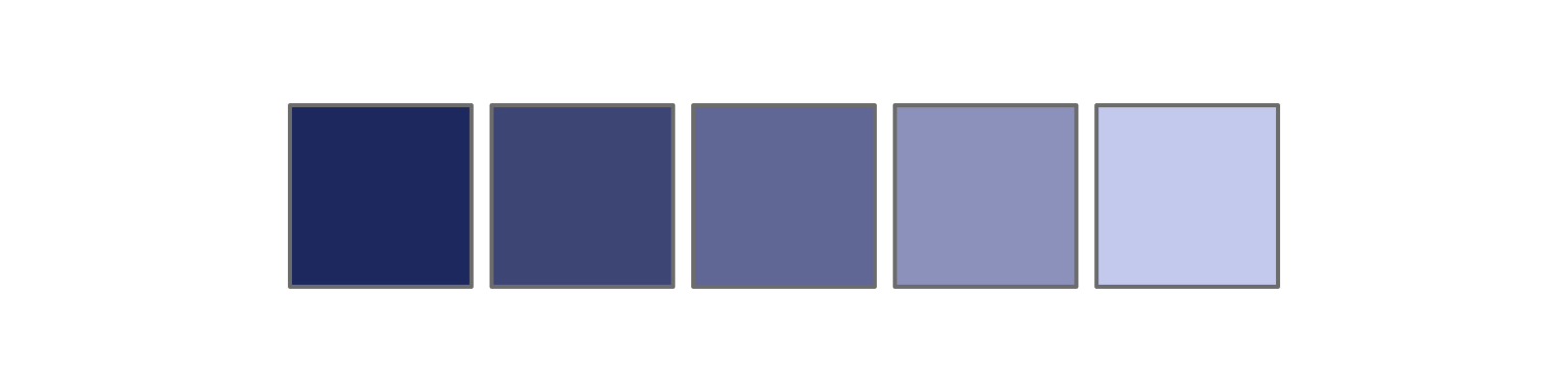 colorspace::sequential_hcl(5, palette = "Red-Blue") |> swatch()