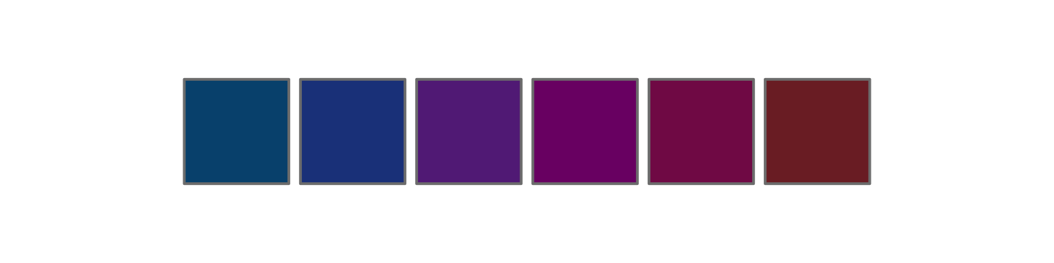 colorspace::rainbow_hcl(6, c = 60, l = 30, start = 230, end = 370) |> swatch()
