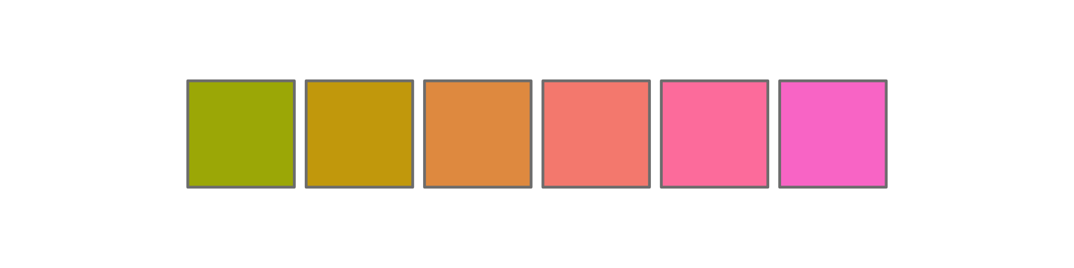 colorspace::qualitative_hcl(6, palette = "Warm", c = 80) |> swatch()