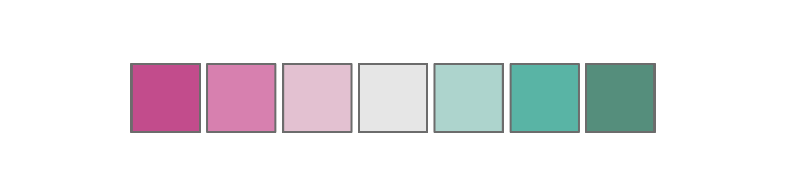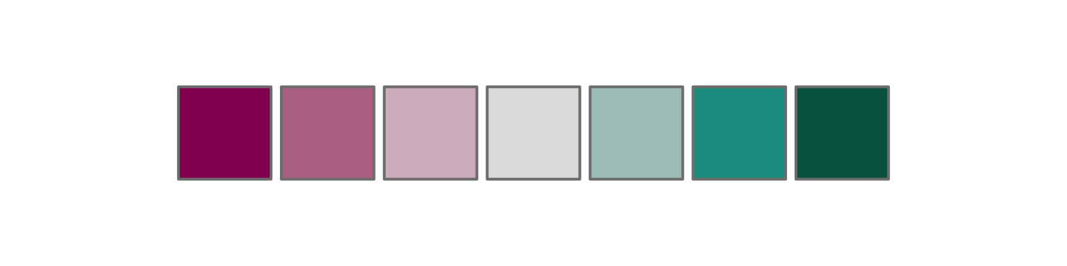 colorspace::diverging_hcl(n = 7, h = c(700, 180)) |> swatch()