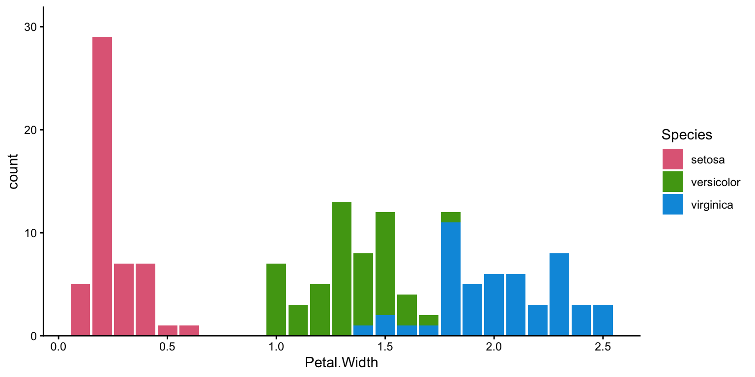 geom_bar(aes(Petal.Width, fill = Species)) +
