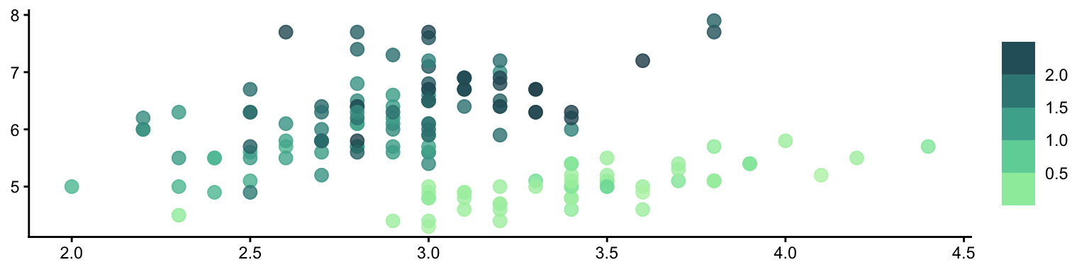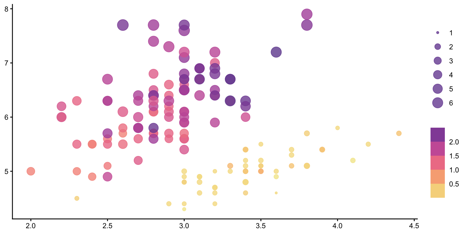 geom_point(aes(Sepal.Width, Sepal.Length, color = Petal.Width, size = Petal.Length), alpha = .8) +