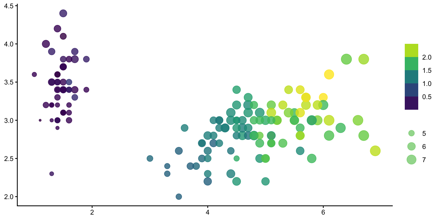 geom_point(aes(Petal.Length, Sepal.Width, color = Petal.Width, size = Sepal.Length), alpha = .8) +