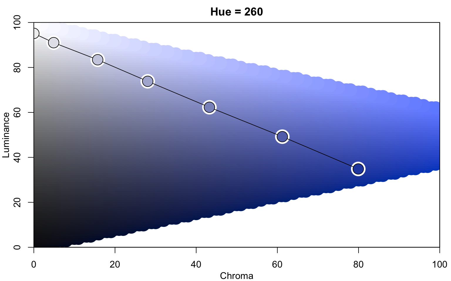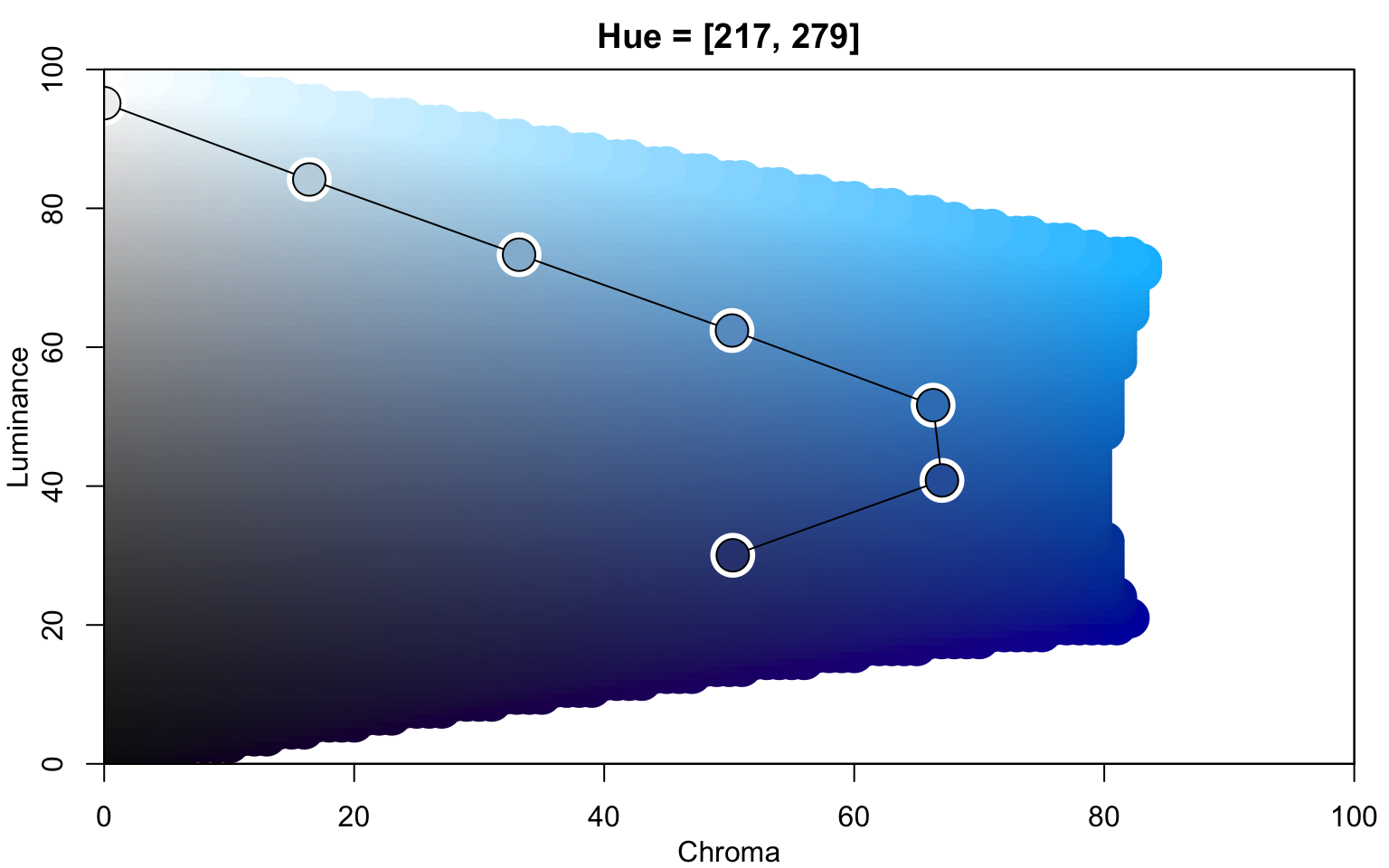 colorspace::hclplot(sequential_hcl(7, h = c(260, 220), c = c(50, 75, 0), l = c(30, 95), power = 1))