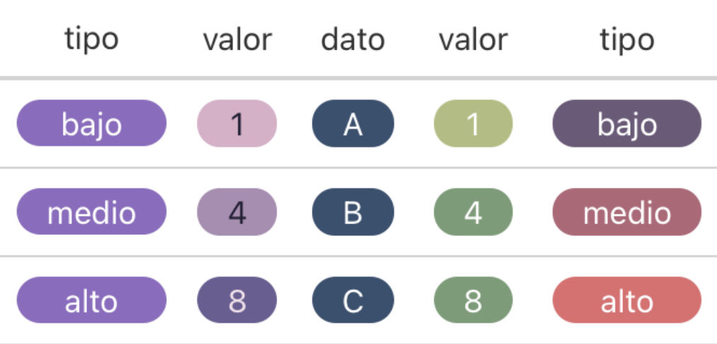 Finalmente, podemos crear distintas funciones de píldoras para distintos tipos de datos. Por ejemplo, una para variables categóricas, otra para variables numéricas, y otra para valores con color manual: