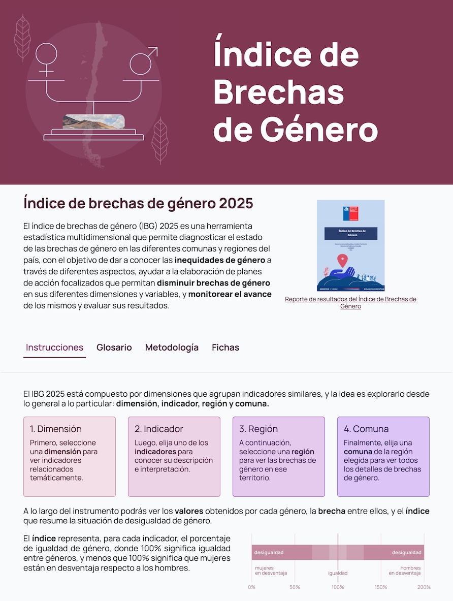 El Índice de Brechas de Género es un nuevo instrumento estadístico desarrollado por la Subsecretaría de Desarrollo Regional y Administrativo (Subdere), diseñado para medir brechas de género a nivel comunal y regional en el país. El IBG se basa en 52 indicadores de nivel comunal y regional, que abarcan las dimensiones de cultura, educación, salud, laboral, participación y social.