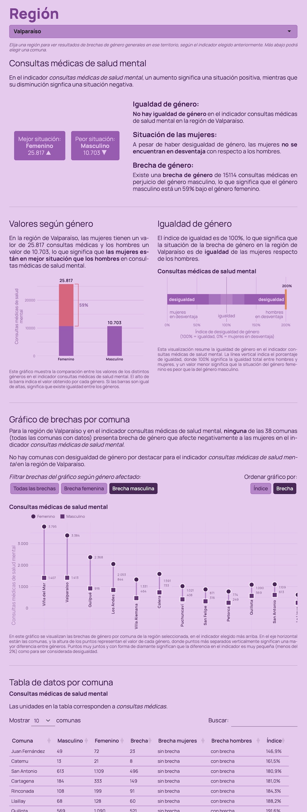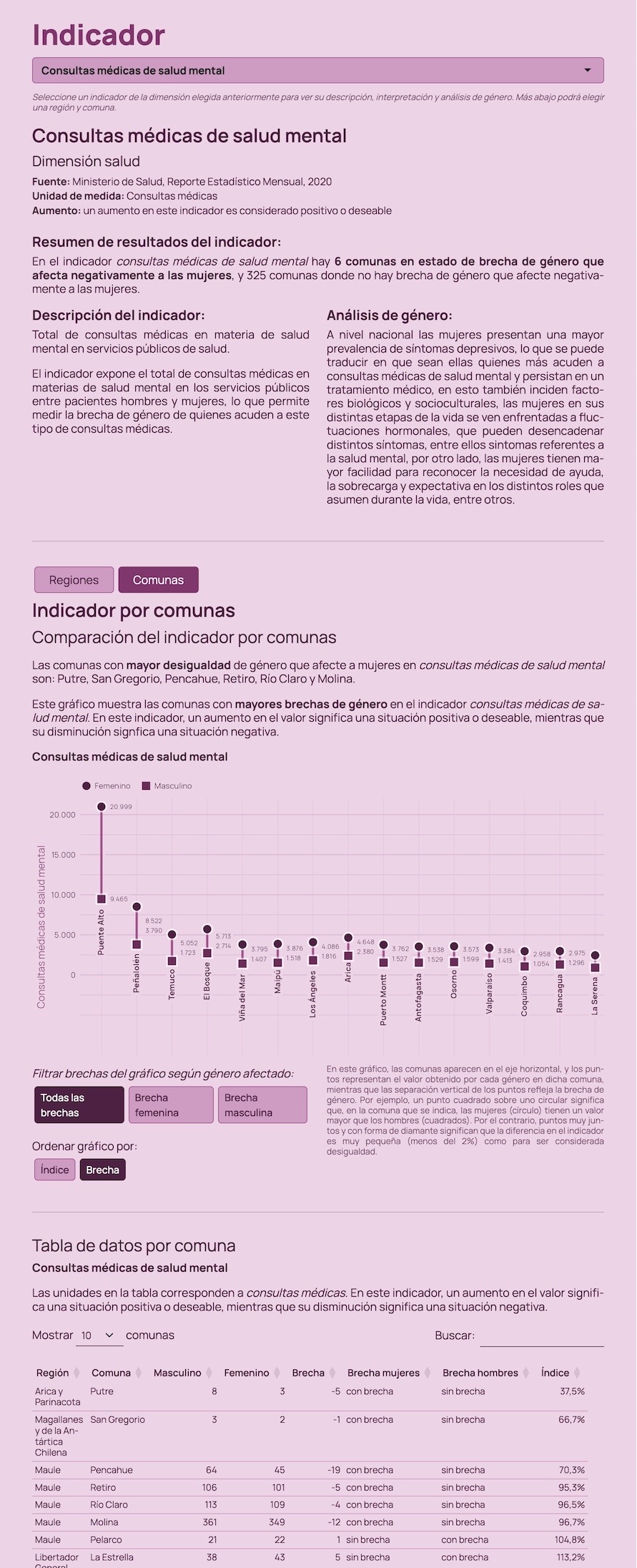 La lógica de presentación de los resultados va desde una exploración desde lo general a lo particular: las y los usuarios empiezan eligiendo el aspecto más general del estudio, la dimensión, para luego elegir un indicador de la dimensión elegida y recibir resultados generales, con la posibilidad de continuar bajando por la plataforma para indagar en resultados regionales y finalmente comunales. De este modo, la plataforma entrega un análisis de brechas de género en múltiples niveles de detalle.