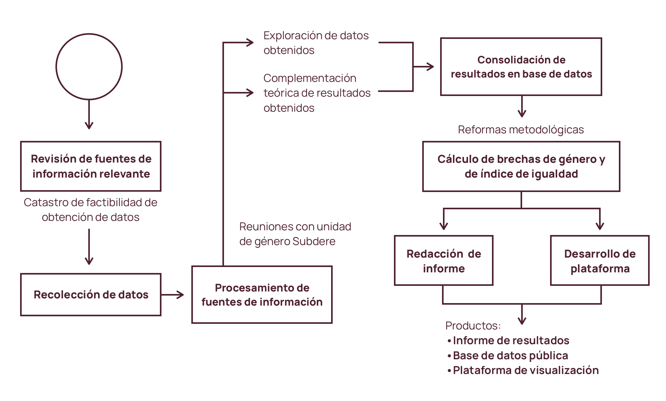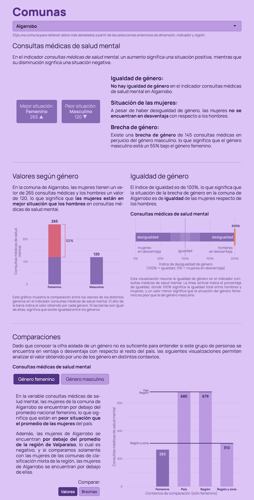 Para producir este instrumento se realizaron búsquedas exhaustivas de datos sociales de nivel comunal que cuenten con desagregación de género, incluyendo múltiples solicitudes de datos por ley de transparencia a servicios públicos. Así, el Departamento de Estudios y Análisis Territorial de Subdere ha desarrollado una plataforma de visualización de datos única en la cantidad de información con perspectiva de género disponible, además complementada con interpretaciones teóricas y conceptuales de cada indicador.