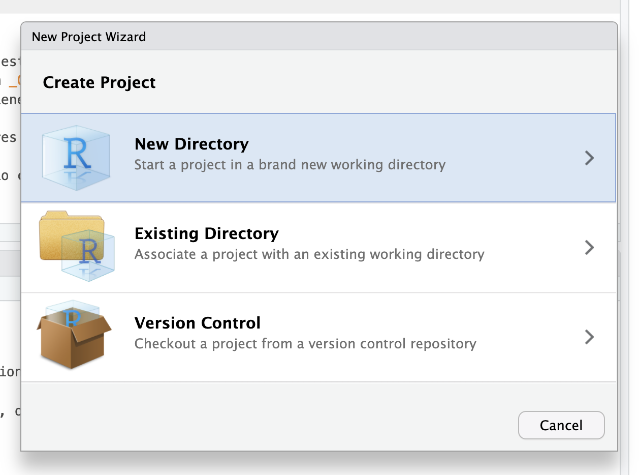 Para crear un proyecto nuevo, elegimos la opción New Project… en el menú File, o apretamos el ícono del cubo celeste ubicado en la esquina superior derecha de RStudio y elegimos la primera opción.