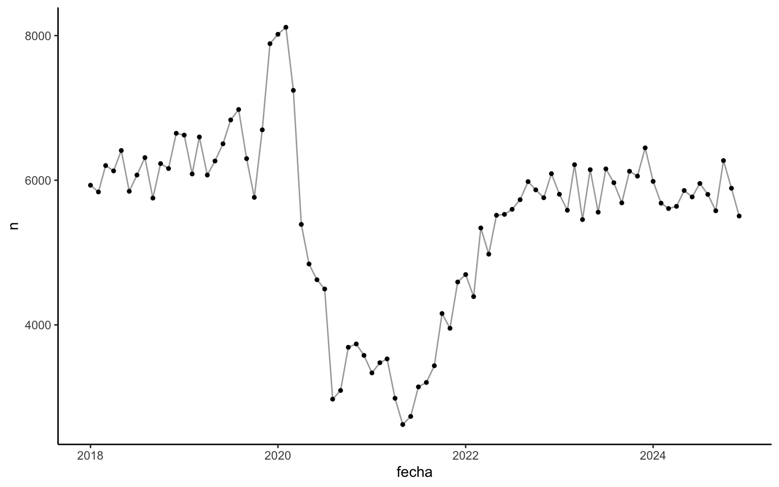 En este caso, definiremos la tipografía general del gráfico al incluirla en el llamado a theme_classic(), y dentro de la especificación del tema (theme()) modificaremos la apariencia del subtítulo, de las líneas en el panel del gráfico correspondientes al eje horizontal, eliminaremos el título del eje vertical y las rayitas de los ejes, y especificaremos el tipo de letra del texto del eje vertical.