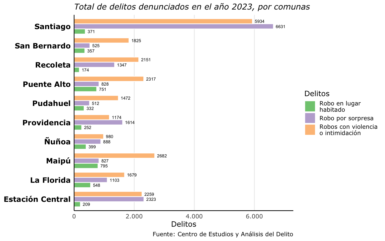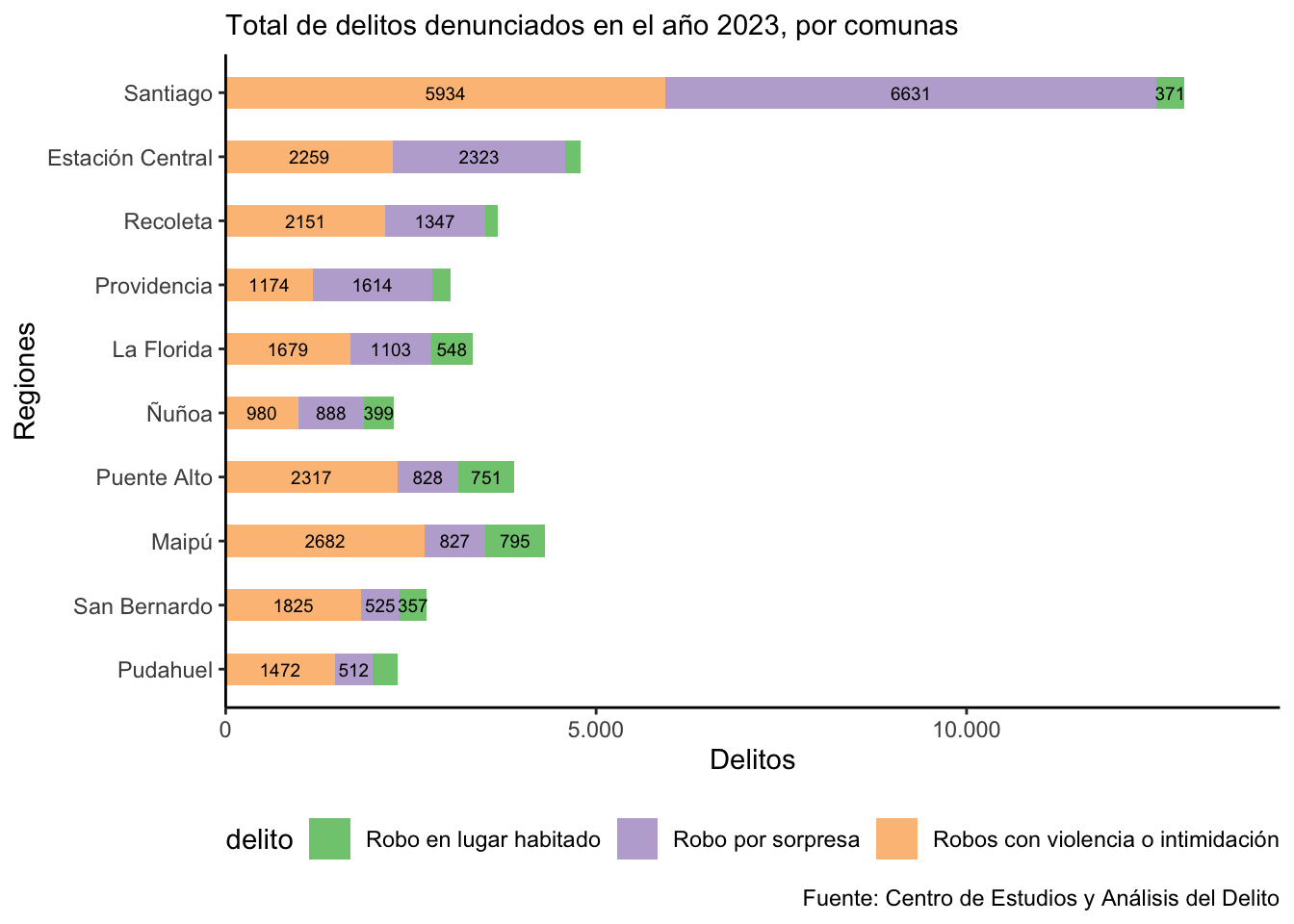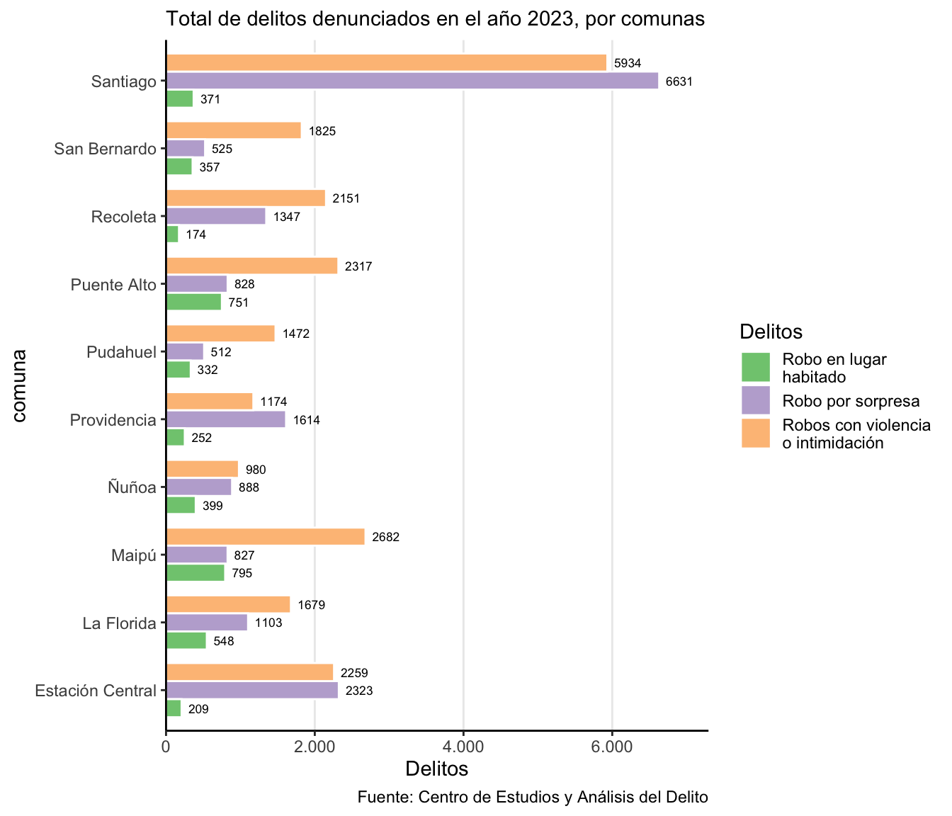 labs(subtitle = "Total de delitos denunciados en el año 2023, por comunas",