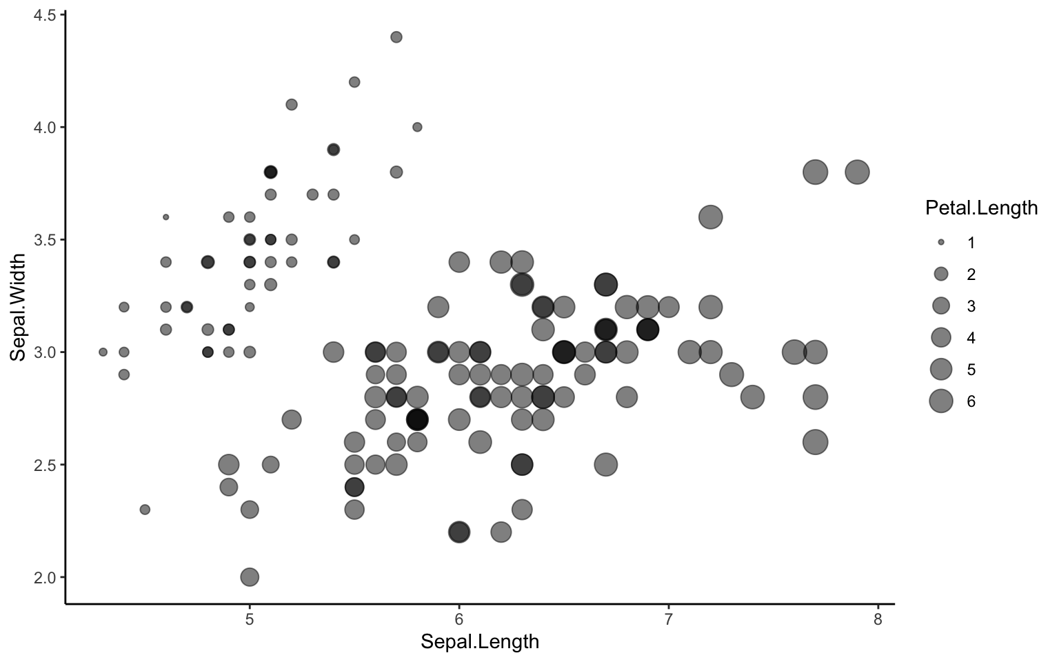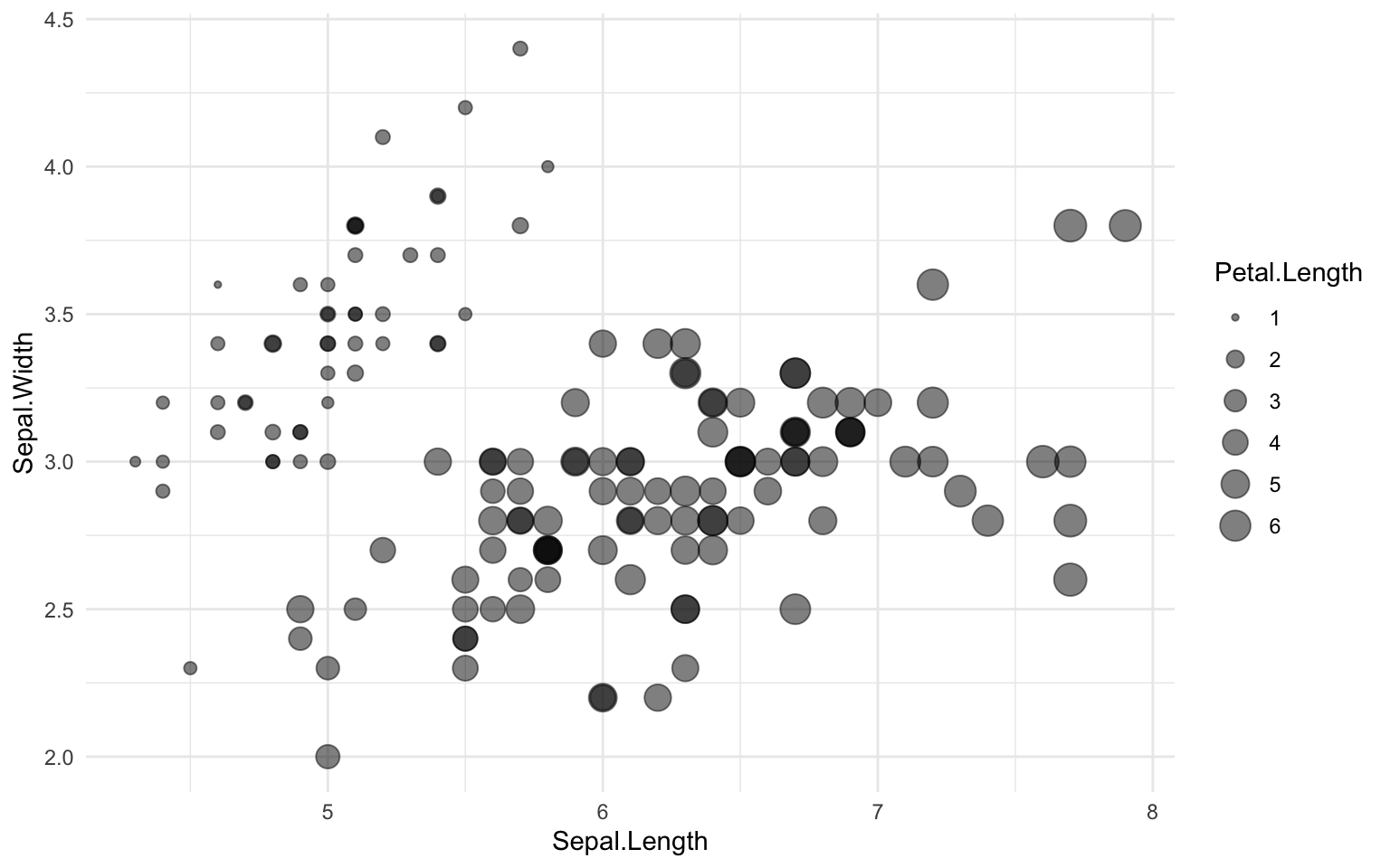 aes(x = Sepal.Length, y = Sepal.Width, size = Petal.Length) +