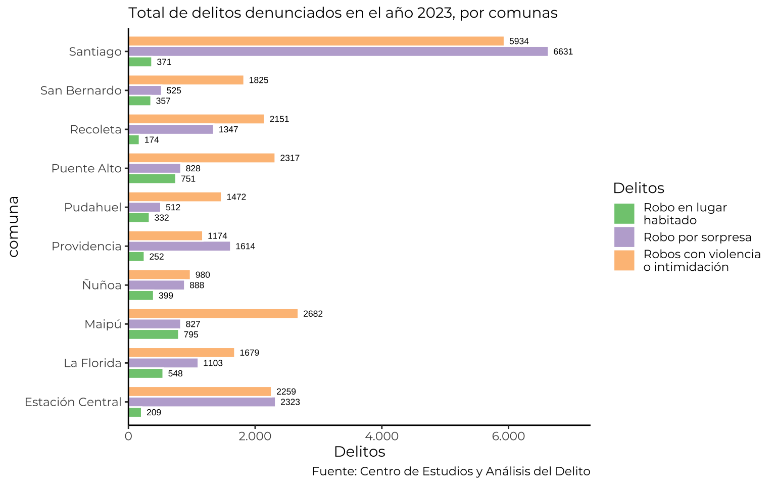Creamos un gráfico de barras, que en el eje horizontal tenga los valores y en el vertical tenga las comunas, y usamos las categorías de delitos como el relleno de color: