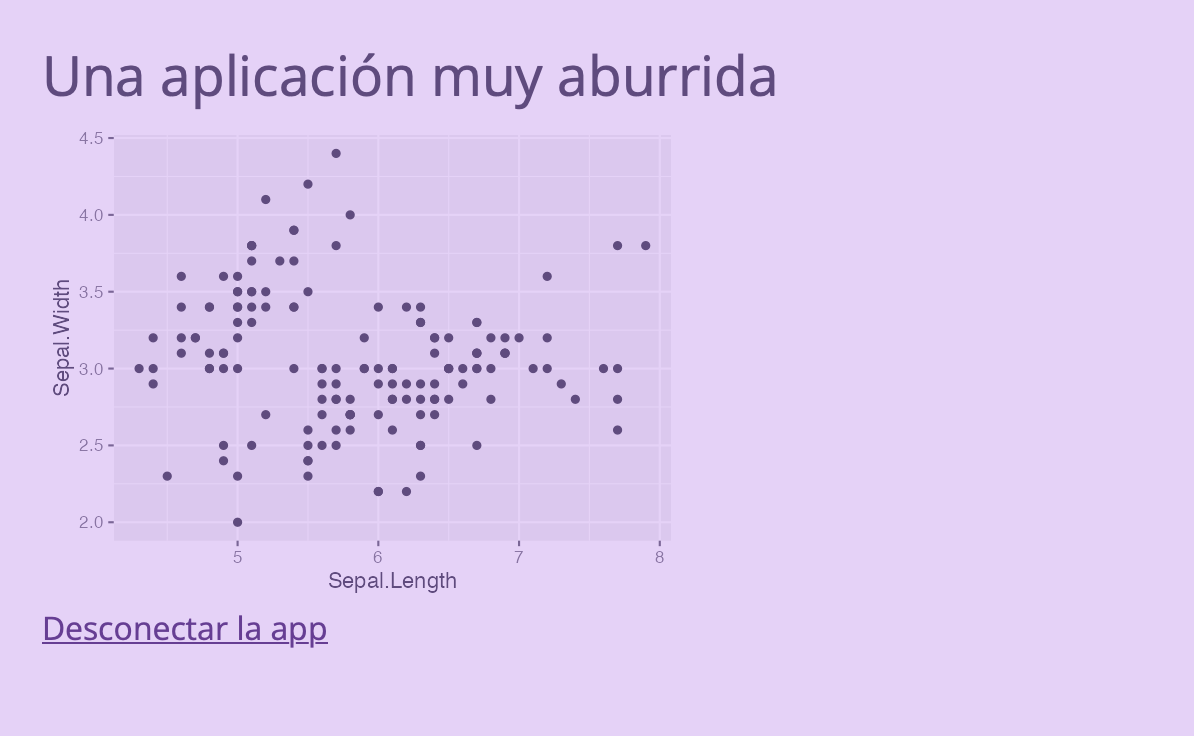 Las aplicaciones Shiny funcionan con un servidor detrás, que es el proceso de R que realiza los cálculos necesarios para mostrar tus contenidos. Por lo mismo, estas aplicaciones no pueden estar conectadas por siempre, porque el proceso no puede estar esperando que la o el usuario hagan algo por siempre, así que y luego de un tiempo de inactividad se desconectan.
