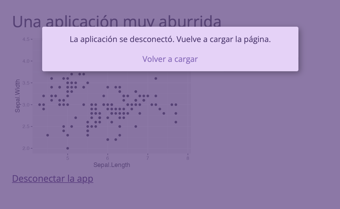 Para mejorar la experiencia de uso podemos configurar mensaje de desconexión más amigable. Con el paquete {shinydisconnect} de Dean Attali podemos personalizar el mensaje de desconexión de la app para que les usaries entiendan mejor que la app requiere recargarse.