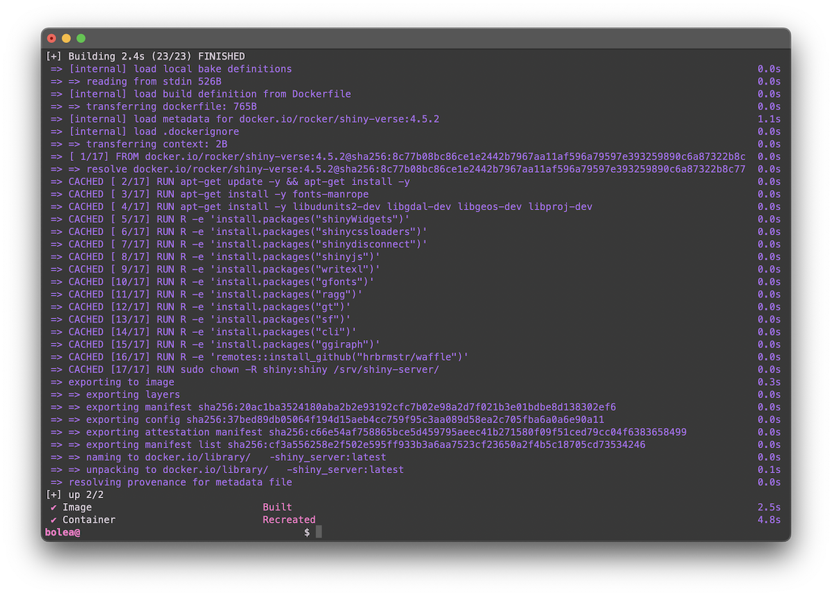 Existen imágenes de Shiny y Shiny-Verse, que es Shiny + paquetes del Tidyverse, para acelerar el despliegue si usas esos paquetes (recomendado).