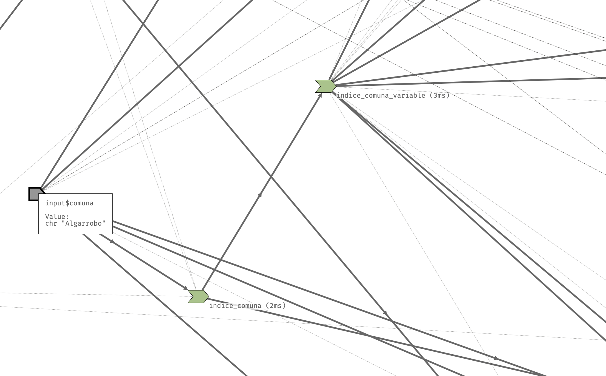 Con {reactlog} puedes explorar visualmente esta cadena o red de dependencias, para entender cómo tu aplicación se va generando, analizar las dependencias entre elementos, y buscar posibles optimizaciones.