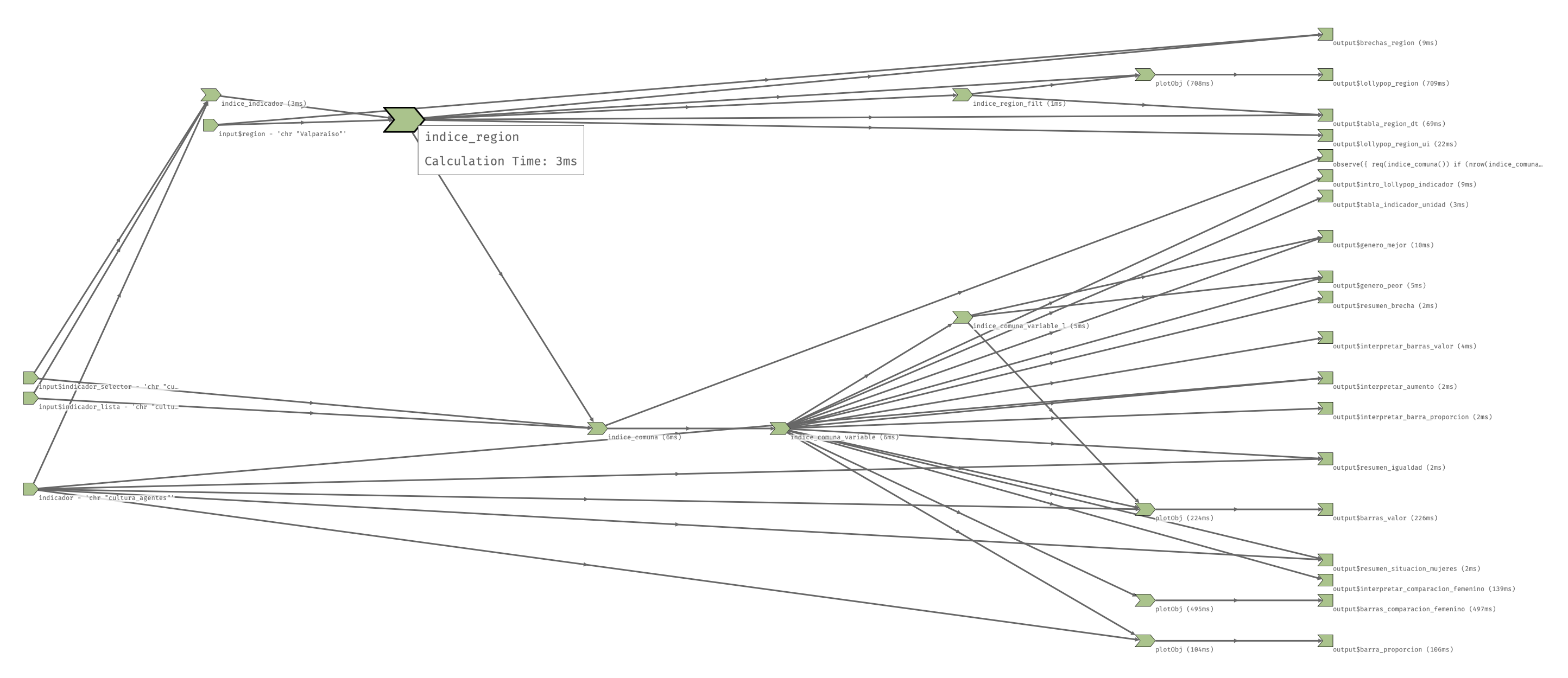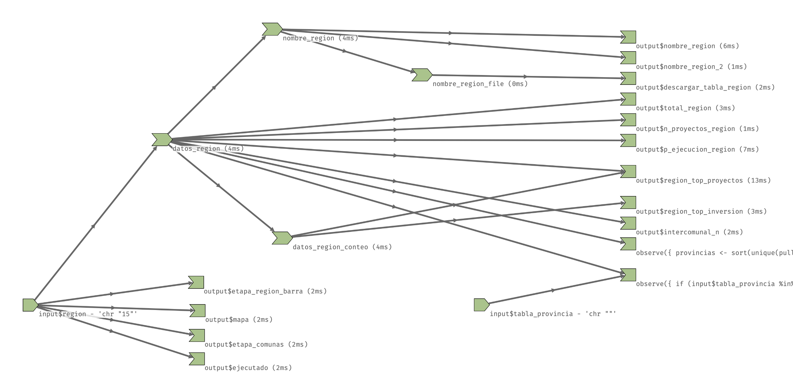 En esta visualización vemos al lado izquierdo los inputs, que usualmente son el principio de la cadena de reactividad. Estos inputs se conectan a las expresiones reactivas que usan sus valores, y éstas a su vez se conectan con otras expresiones reactivas, o con outputs, que salen al lado derecho.