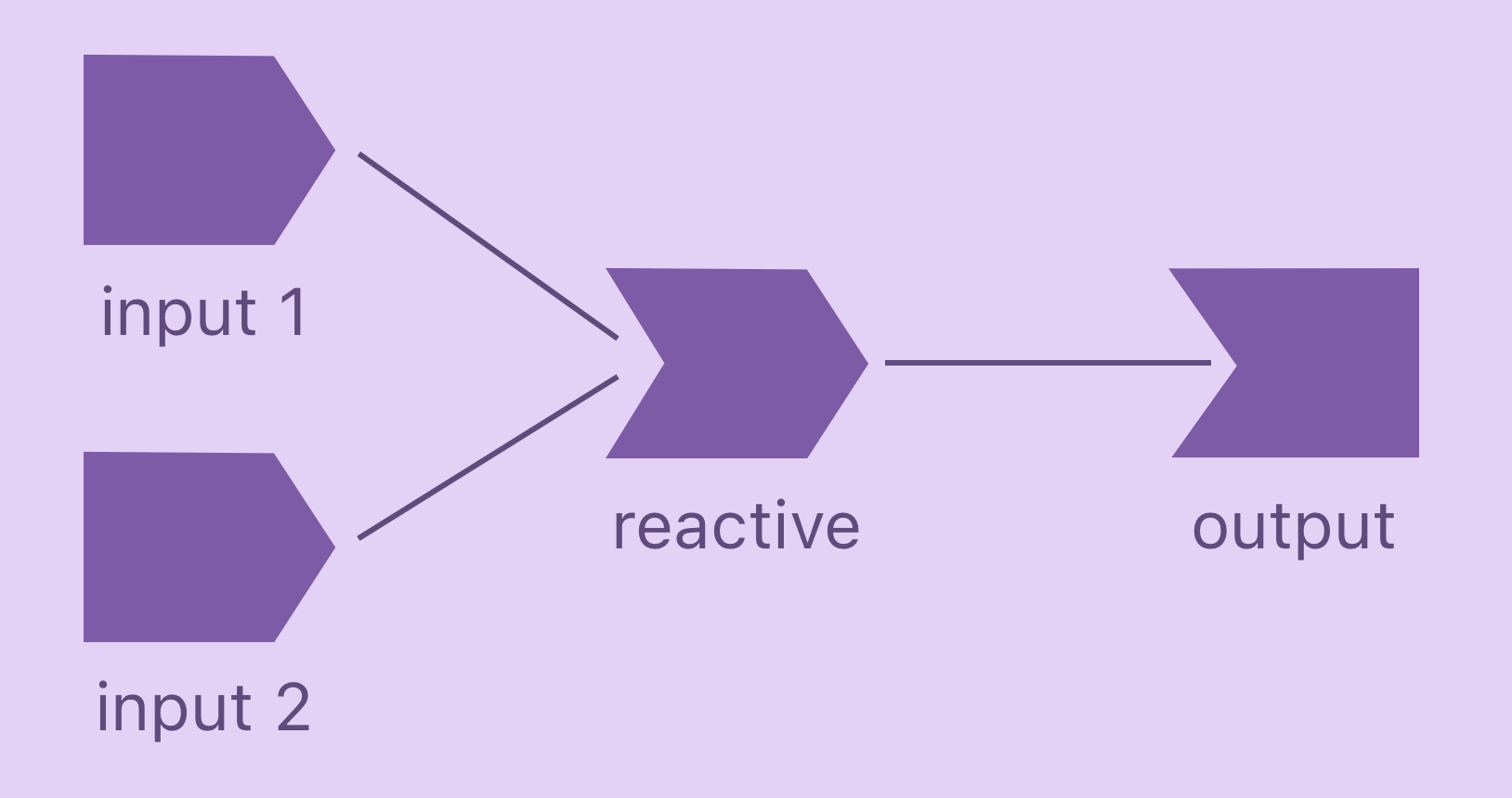 Las aplicaciones Shiny funcionan con reactividad: una cadena de causalidad que va desde los inputs de tu app, pasando por las expresiones reactivas (objetos de R que se actualizan automáticamente cuando cambian sus dependencias), hasta los outputs que se muestran en la interfaz de usuario.
