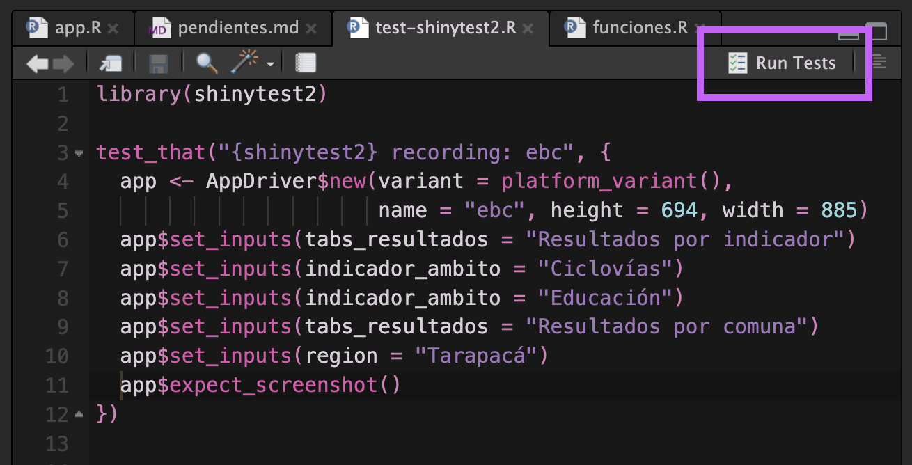 Para crear una expectativa del test; es decir, un resultado de la prueba, dependiendo de lo que necesitemos podemos usar app$expect_screenshot() para tomar una captura de pantalla, o app$expect_values() para validar que los valores de los outputs sean los esperados.