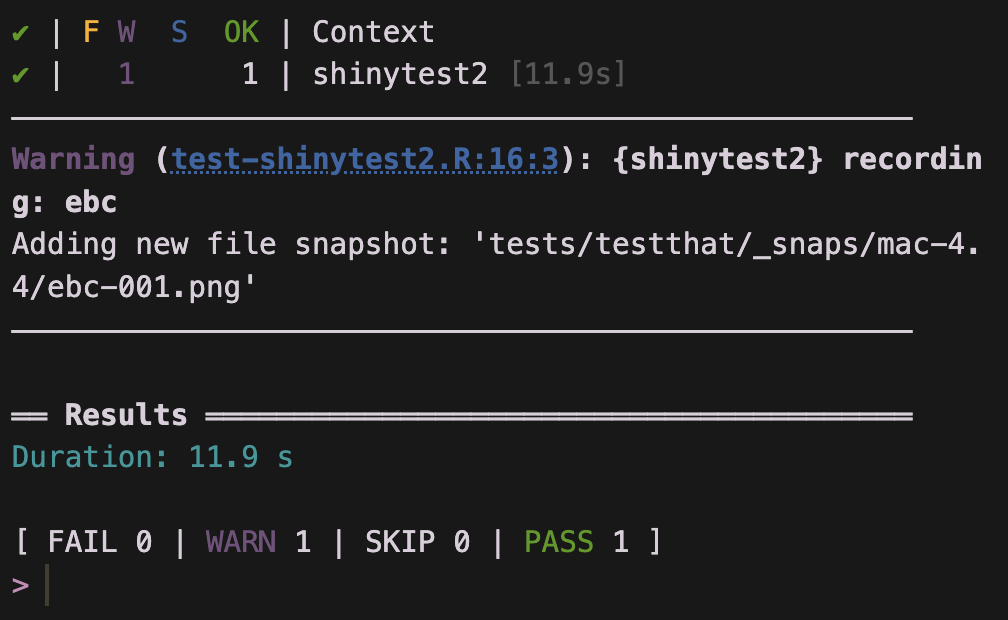 Cuando termines de simular una visita a tu app presiona Save test and exit. Esto generará automáticamente un archivo de pruebas en la carpeta tests/testthat/ de tu aplicación Shiny, que se abrirá y de inmediato ejecutará la prueba en el fondo; es decir, tu app se ejecutará de manera invisible reproduciendo los pasos que tomaste.