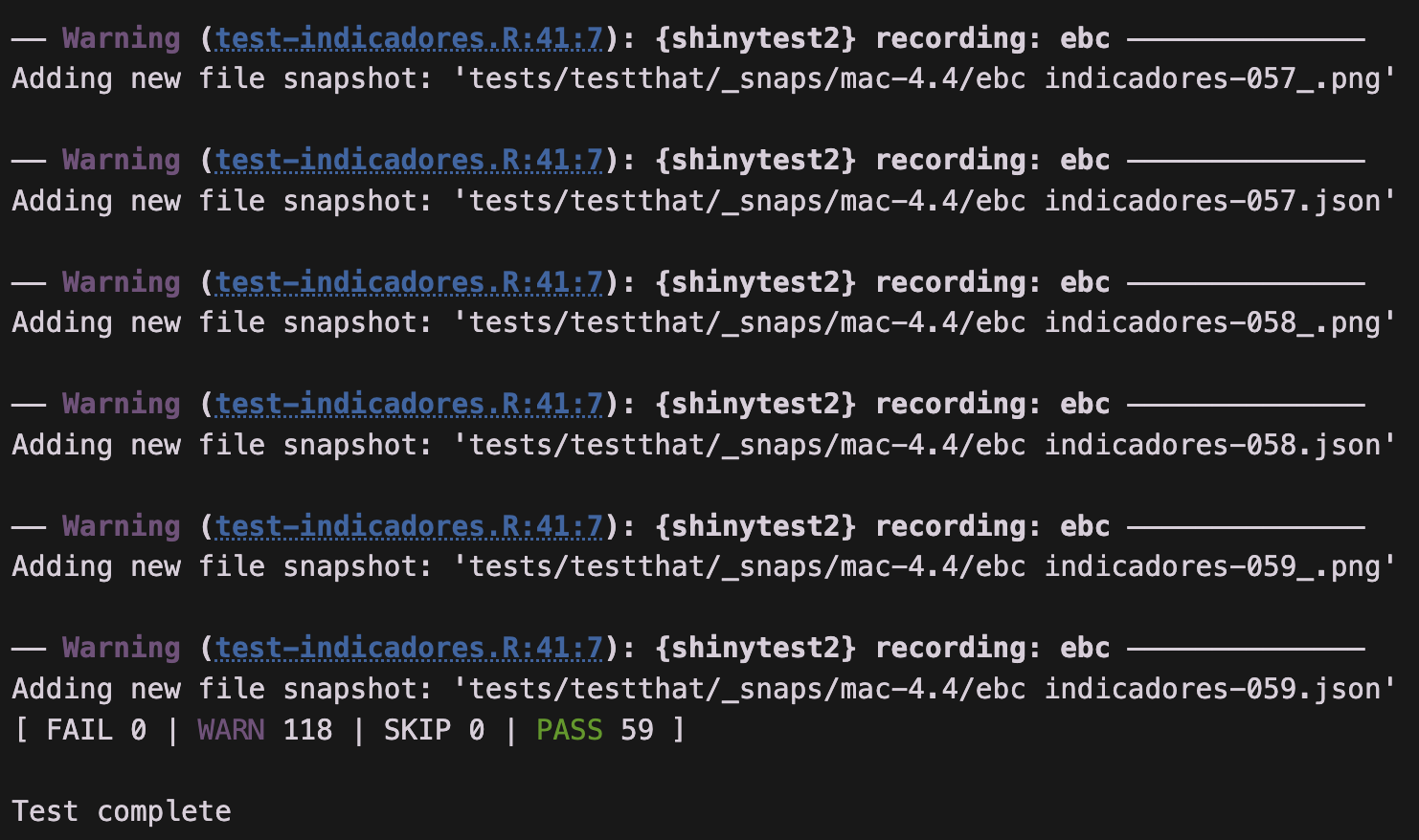 Al terminar los tests, en la carpeta tests/testthat/_snaps/ estarán los resultados de las pruebas, que pueden ser capturas de pantalla o archivos JSON con los valores de los inputs y outputs de la app en cada prueba.
