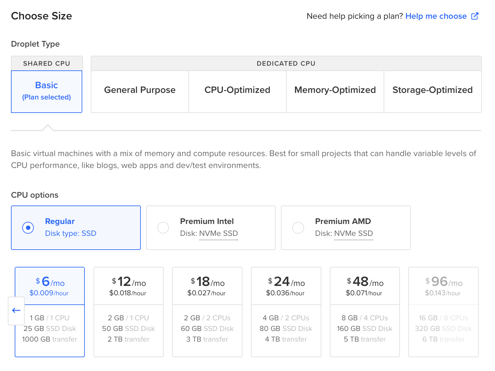 Elegir la configuración del droplet